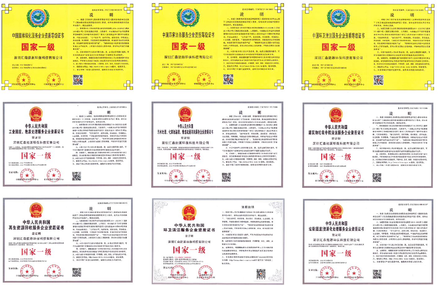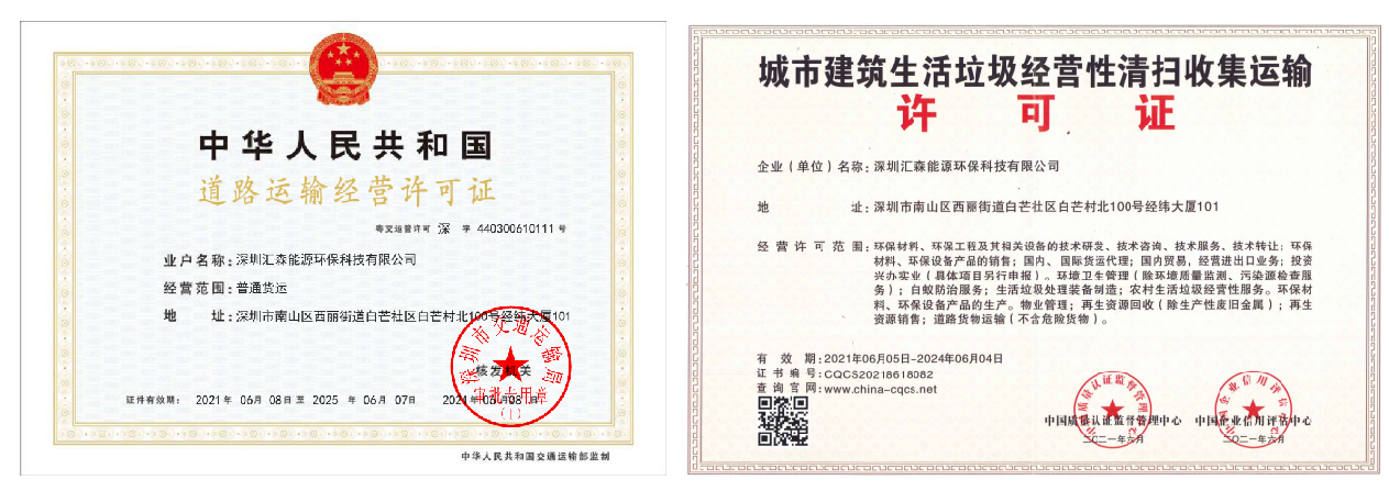 中華人民共和國道路運輸經營許可證、國家一級環衛清潔服務企業、國家一級建筑垃圾中轉清運服務企業,國家一級工業固廢、危廢處理服務企業、國家一級污水、化糞池清理、管道疏通清洗服務企業、國家一級垃圾資源化處理服務企業、國家一級再生資源回收服務企業、國家一級環衛清潔服務企業、國家一級四害消殺服務企業、城市建筑生活垃圾經營性清掃收集運輸許可證、國家一級園林綠化服務企業等證書等等···